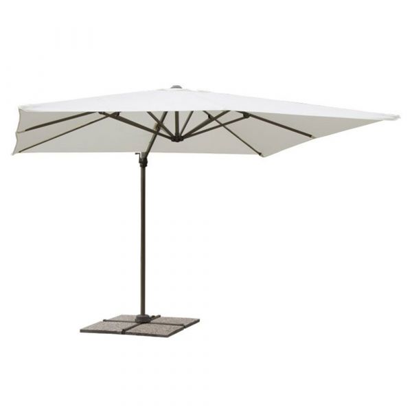 Ombrellone a braccio Deluxe Ecru. Ombrellone a braccio, reclinabile con struttura in alluminio e copertura in poliestere da 280 gr/mq impermeabilizzato. 8 stecche, cuspide antivento. 360° rotazione. Base a croce. Dimensione: mt 3x3. Vista la dimensione e il peso notevole dell'ombrellone, si raccomanda l'uso di piastre di cemento per il basamento. Confezione: scatola in cartone.