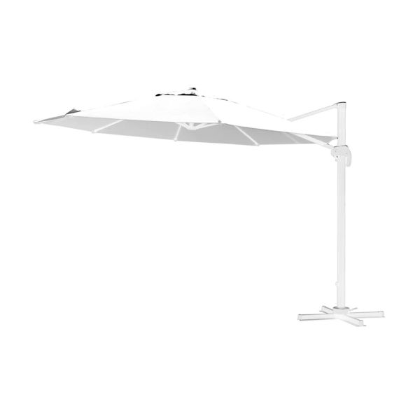 Ombrellone con struttura in alluminio. Colore Bianco. Rotazione a 360° e blocco di posizione. Telo con airvent in poliestere impermeabile 250 gr/mq. Meccanismo easy push-up per aprire/chiudere. Base di sostegno a croce. Dimensioni: - Larghezza 350 cm - Profondità 350 cm - Palo 50×78 mm. Peso: kg 24,5.
