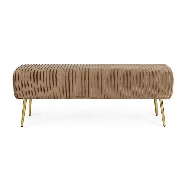 Realizzata con struttura in mdf e compensato, gambe in acciaio cromato color oro, rivestimento in poliestere effetto velluto a coste, densità imbottitura 30kg/m3.