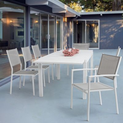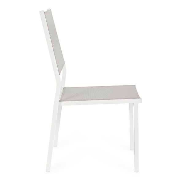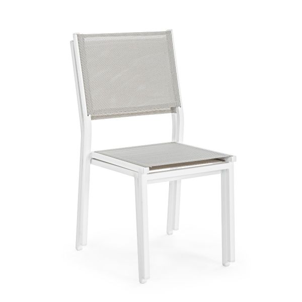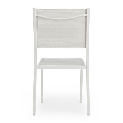 Struttura in alluminio, verniciato a polvere (poliestere). Seduta e schienale in Textilene. Misure: 46x57xh. seduta 43,5xh. tot 88 cm. Impilabile. Colore: Bianco Cloud.